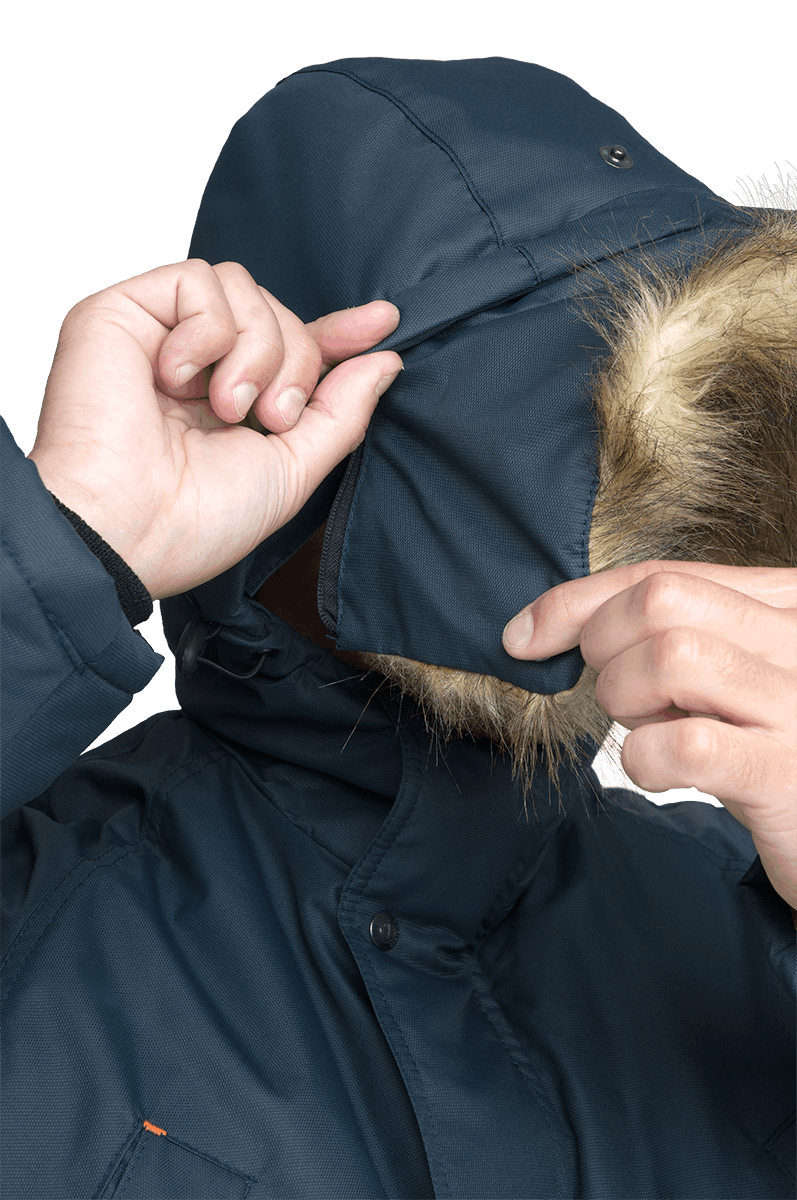 • капюшон с регулировкой объёма и съёмной меховой опушкой