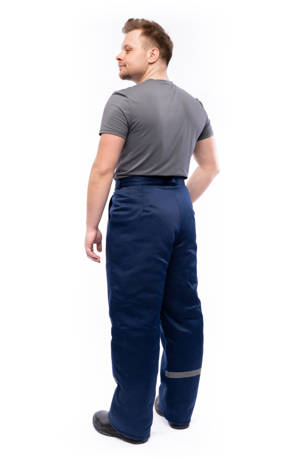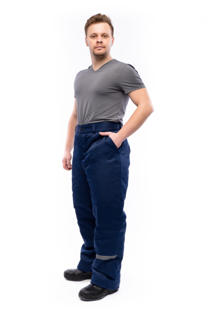 Брюки утепленные с застежкой на петли пуговицы, накладными карманами, узким поясом с 5 шлевками, светоотражающей лентой 2,5 см по правой калоше брюк.